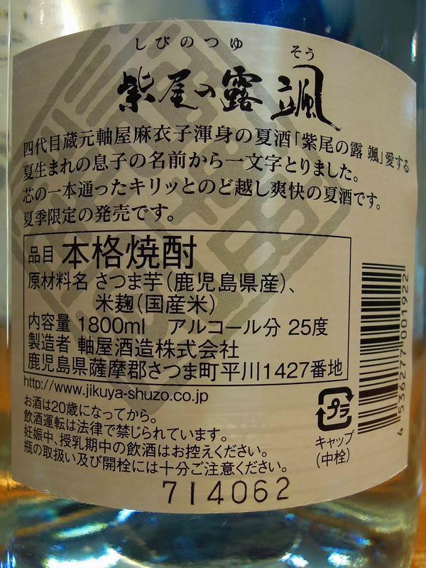 【紫尾の露 颯(しびのつゆ そう)夏焼酎 1800ml 25度 軸屋酒造】